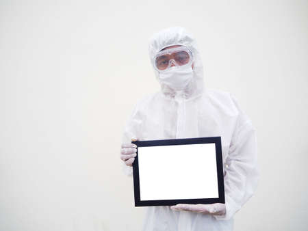 Asian doctor or scientist in PPE suite uniform. holding white screen square black frames for your design. coronavirus or COVID-19 concept isolated white background
