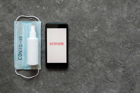The concept of staying at home is the epidemic of the coronavirus covid-19. Antiseptic face mask and phone on a white background. View from above copy space.