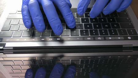Doctor's Hands in Blue Surgical Gloves Typing on Laptop Keyboard