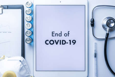 End of covid. Medical equipment: doctor stethoscope, hospital healthcare charts, syringe with needle and white tablet with text on screen. End of COVID concept