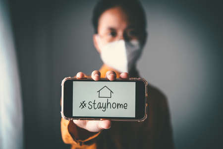 Asian girl wearing glasses, wearing a mask, holding the phone labeled #stayhome, is bored of having to detain and treat the illness at home alone. Concept home quarantine, prevention COVID-19