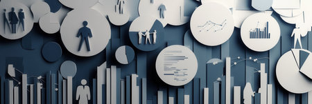 This abstract image showcases financial data through varied charts and graphs, combined with icons and textures, perfect for business presentations and marketing materials.