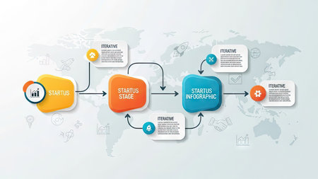 An infographic showcases business-related concepts, utilizing vibrant colors and stylized graphic elements. The composition includes textual components suggesting various stages of a process, along with decorative icons. It indicates teamwork and growth in a digitally illustrated design. Suitable for editorial and commercial use.
