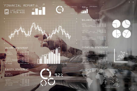 Financial report data of business operations (balance sheet and income statement and diagram) as Fintech concept.Double exposure of businessman hand using mobile payments online shopping.