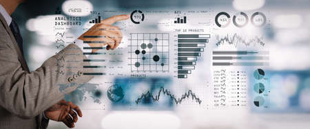 Big Data Technology for Business Finance Analytic conceptual. Modern graphic interface shows massive information of business sale report, profit chart and stock market analysis on screen monitor.
