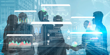 Creative visual of business people in corporate staff meeting . Concept of digital technology for marketing data analysis and investment decision making .