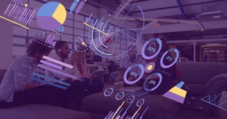 Image of financial data processing over diverse business people. Global business, finances, computing and data processing concept digitally generated image.