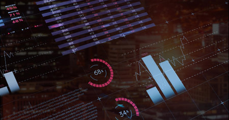 Displaying dashboard over office window at dusk, with table of indices, bar charts, gauges. Technology, analytics, data, innovation, modern, corporate, futuristic