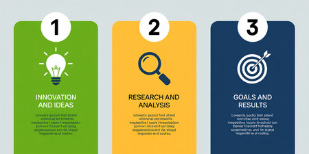 An infographic showing three steps: innovation and ideas, research and analysis, goals and results.