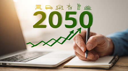 A person's hand is seen writing on a notepad with a pen, next to a laptop. The image features a prominent '2050' with green growth arrows. The scene is brightly lit, suggesting an indoor setting with a focus on sustainable development and future planning, suitable for various editorial and commercial applications.