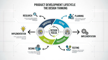 An illustrated diagram depicts the product development lifecycle, showcasing the design thinking process. The circular graphic displays several interconnected stages with corresponding icons, representing research, design, prototype, and implementation. The style incorporates bright colors, suggesting commercial and editorial applications.