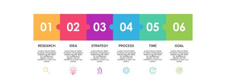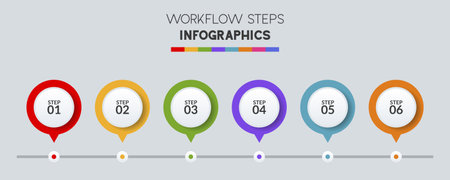 Horizontal progress bar featuring 6 arrow-shaped elements, symbolizing the six stages of business strategy and progression. Clean timeline infographic design template. Vector for presentation