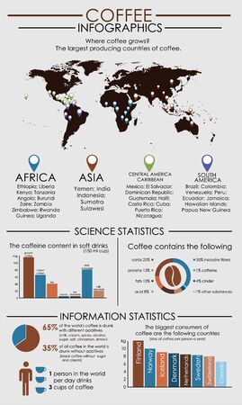 Coffee infographics with world map and a pointer to it, coffee producing countries, diagrams and graphics coffee statistics. Vector illustration