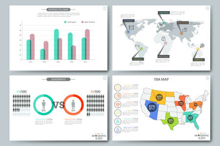 Simple infographic templates. Bar chart, world and USA maps with pins and percentage indication, elements for demographic proportion visualization