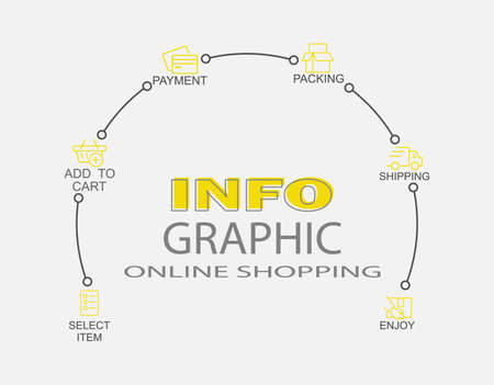 Infographics of online store purchases. 6 steps to visualize the process with pictograms of the sequence of actions. Layout design for a website, brochure, presentation.