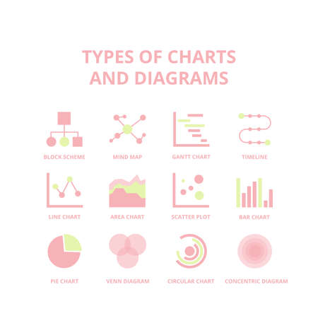 Types of various charts and diagrams. The set of schemes and graphs. Statistical data and financial information visualization. Vector illustration for business presentation, report, infographics