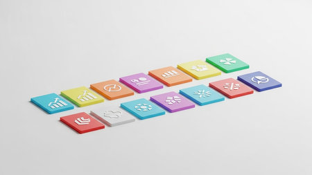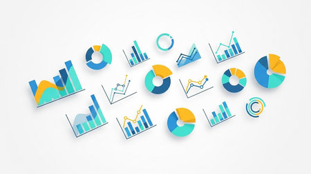 A vibrant collection of data visualization elements including colorful charts and graphs arranged on a dark surface, ideal for business analysis and presentation needs.