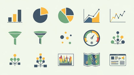 A collection of flat outline icons representing data analysis business intelligence and strategy concepts on a light background.