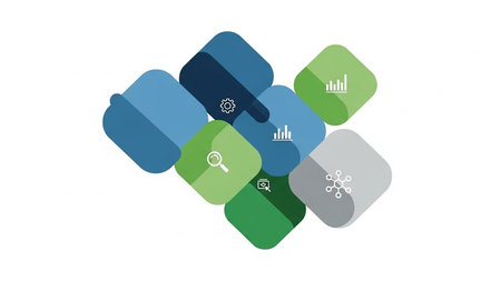 Overlapping rounded squares in blue, green, and grey feature icons for data analysis, search, and settings on a clean white background.