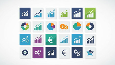 A collection of colorful 3D icon tiles representing various business and finance concepts arranged in rows on a white background.