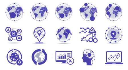 Abstract blue icons representing global technology, network connections, data security, AI, location services, and digital analysis systems. Clean graphics for modern tech, communication, business design