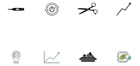 A grid of business and finance icons illustrating concepts such as financial decline, shopping cart issues, broken technology, and negative sentiment.