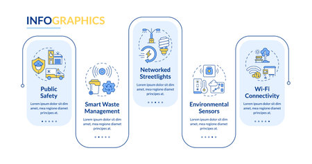 Smart city infrastructure and services rectangle infographic vector. Urban development. Data visualization with 5 steps. Editable rectangular options chart. Lato-Bold, Regular fonts used