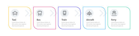 Public transport types square horizontal infographic 5 steps. Passenger transportation service. Traveling by various vehicles. Editable thin line icons diagram process. Lexend Montserrat font used