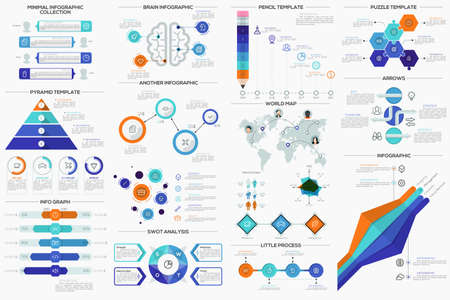 Big collection of flat minimal infographic templates. Vector. Can be used for web design, workflow layout, social media, presentations, brochures, entertainment and games.