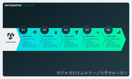 Vector infographics arrows with 5 successive steps, labels. Can be used for diagram, business,, workflow layout, presentations, flowchart, info graph, timeline, levels, chart, processes diagram