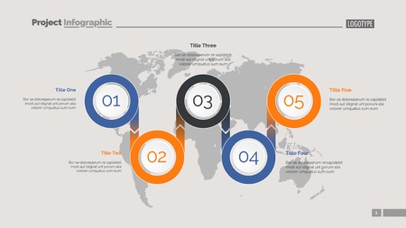 Five options process chart slide template. Business data. World map, diagram, design. Creative concept for infographic, presentation. Can be used for topics like management, research, logistics.
