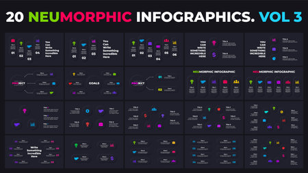 Neumorphic vector dark infographics. Circle diagrams. Presentation slide template. Clean minimal flat style.