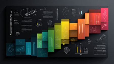A vibrant collection of data visualization elements including colorful charts and graphs arranged on a dark surface, ideal for business analysis and presentation needs.