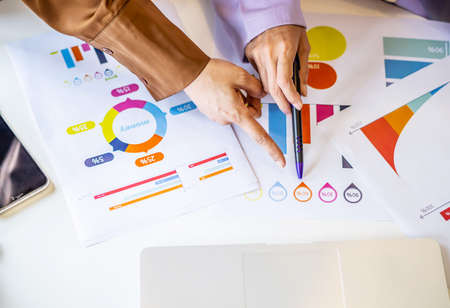 Top view. Two muslim businesswoman accountant pointing paper showing graphic chart on work in the office by analyzing the data sheets, laptops, tablets and graphs on their desks