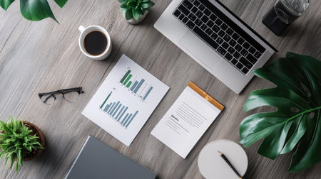 A visually engaging workspace featuring colorful charts and graphs alongside planters, ideal for presentations, data analysis, and professional brainstorming sessions.