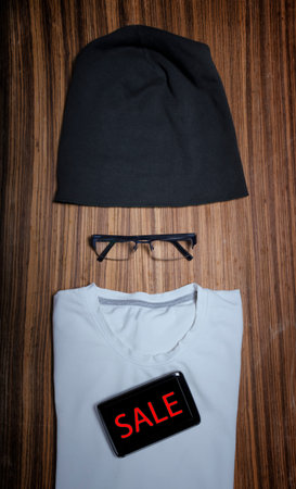 Informal male outfit with cellphone and headphone, background