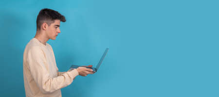 Businessman with a blue jacket on a gray background with a laptop in his hands