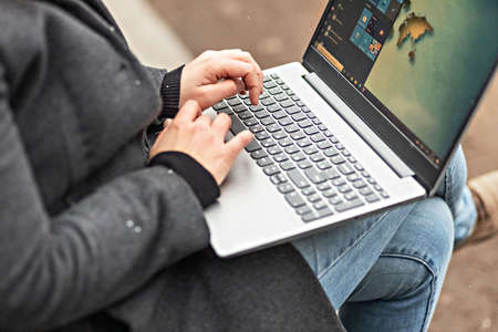 Young woman working on laptop sitting on a park bench with coffee. Computer and online shopping use. Distance learning, online education