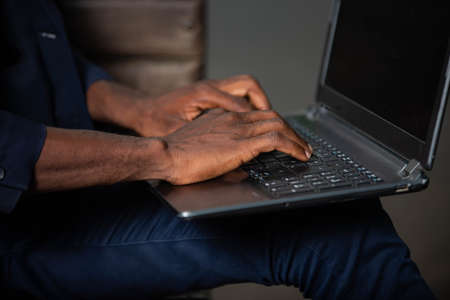 Close up male hands typing on laptop keyboard, African American man working online, blogger preparing new post for blog, businessman writing financial report or email, using computer apps