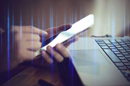 Man using mobile and laptop Business technology and data customer connection.