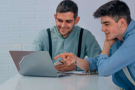 Jakarta, Indonesia - October 2022: two men are having a discussion in the Jakarta library using a cellphone and laptop.