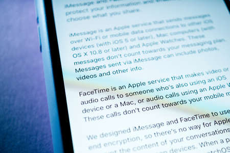 Paris, France - Jan 30, 2018: Detail of on the iMessage and FaceTime privacy contract as seen on the iPhone XS smartphone display manufactured by Apple Computers - blue tone