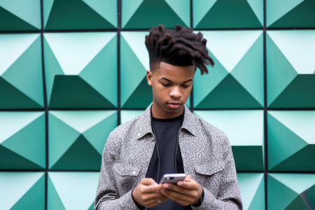 cropped shot of a young man texting on his cellphone with geometric shapes in the background, created with generative ai