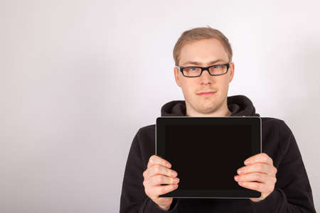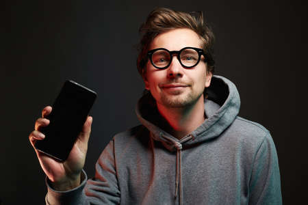 Smiling Man in glasses. happy boy. Modern guy holding and showing his smartphone