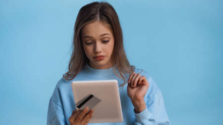 teenage girl in sweatshirt holding credit card and digital tablet isolated on blue