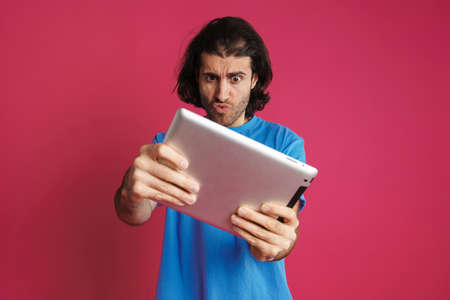 Unshaven white man playing online game on tablet computer isolated over pink background