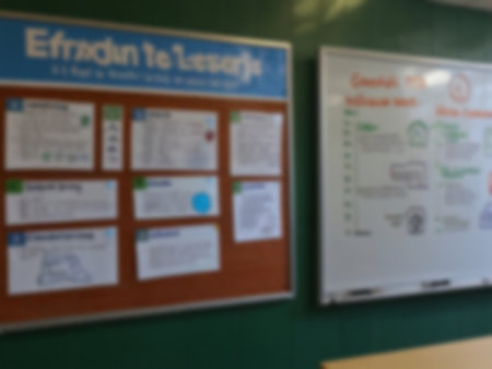 Blurred background of school classroom with whiteboard and copy space.