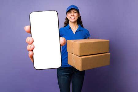 Happy female delivery person carrying packages while delivering and using a mobile app to work