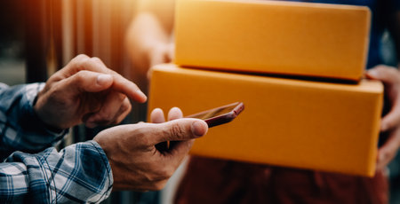 Close up of delivery man holding a cardboard box and using smart phone