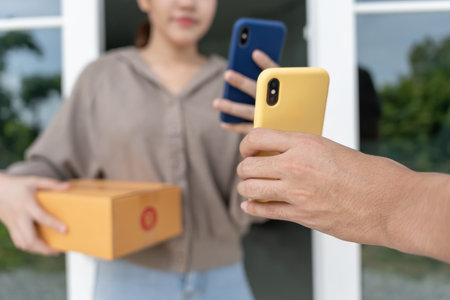 cheerful courier hands over well branded package delighted customer outside their home, showcasing trust and satisfaction in delivery services